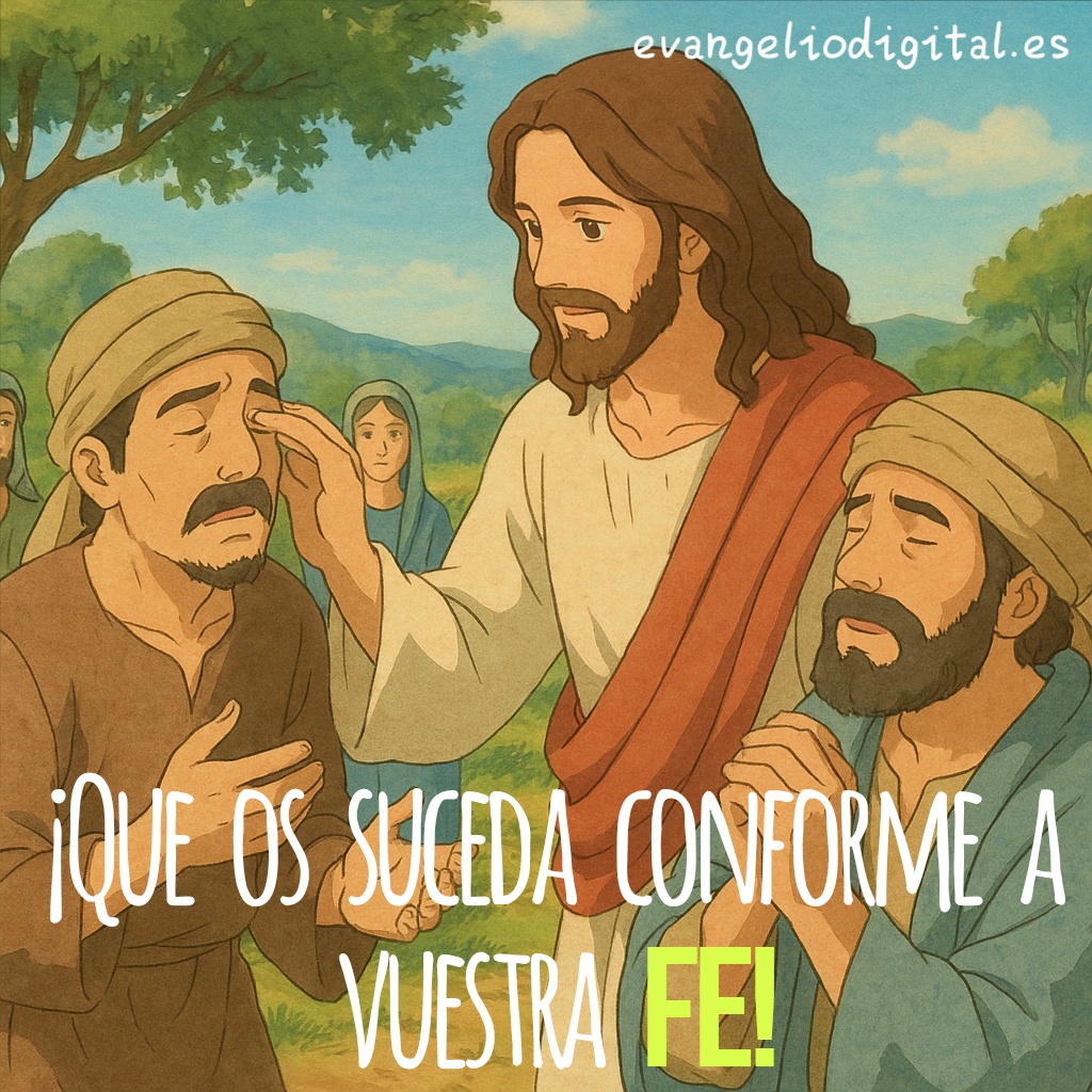 Mateo 9, 27-31 Cuando Jesús salía de Cafarnaúm, lo siguieron dos ciegos, que gritaban: “¡Hijo de David, compadécete de nosotros!” Al entrar Jesús en la casa, se le acercaron los ciegos y Jesús les preguntó: “¿Creen que puedo hacerlo?” Ellos le contestaron: “Sí, Señor”. Entonces les tocó los ojos, diciendo: “Que se haga en ustedes conforme a su fe”. Y se les abrieron los ojos. Jesús les advirtió severamente: “Que nadie lo sepa”. Pero ellos, al salir, divulgaron su fama por toda la región. Para meditar Debemos tener, como estos dos ciegos, una fe inquebrantable en Jesús. Él se preocupa por nosotros, y se complace sobremanera cuando acudimos a…